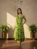 “Brighten your wardrobe with this lime-green floral co-ord set, featuring a sleeveless high-low kurta and matching pants. The bold blue blooms add a lively, summery charm—perfect for breezy daytime outings.”
