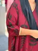 Elegant free-flowing balloon kaftan in rich maroon with bold black leaf prints. Designed for effortless style and comfort, gold lace detailing on the sleeves, perfect for both casual and festive occasions.