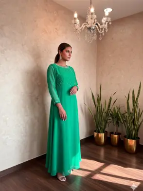 Georgette handwork party wear gown Semi bot neck with heavy handwork embellishments till yoke with cut beats, stone etc... good for evening function