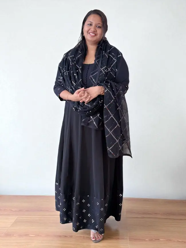 Georgette Panel cut gown with Designer patch on Daman Area and sleeve end Sponge balls on yoke and designer Dupatta