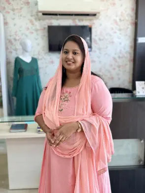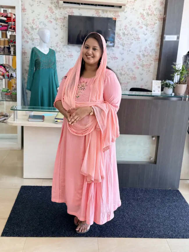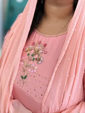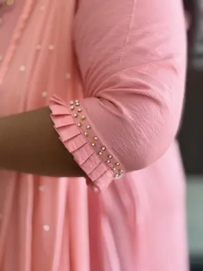 Soft malchanderi 2-piece set with side pleated detailing and pearl-sequin embellished sleeves. The handworked floral yoke adds a touch of elegance, making it perfect for festive and casual occasions alike.