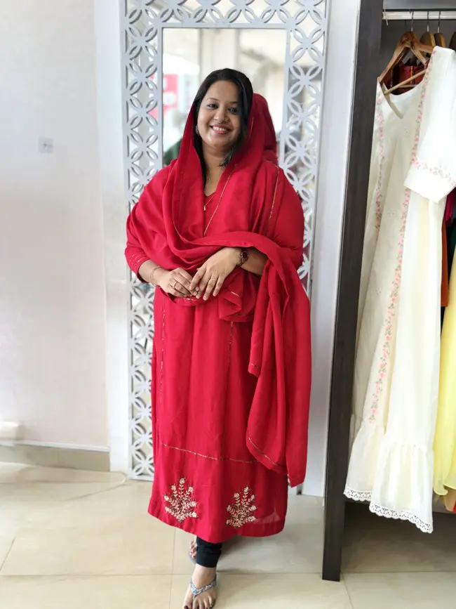 This elegant Vijitra silk outfit features delicate lace detailing on the sleeves and a beautifully finished dupatta with four-side edging. The daman area is adorned with intricate hand worked motifs, adding a refined and graceful touch to the overall look.