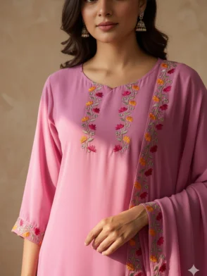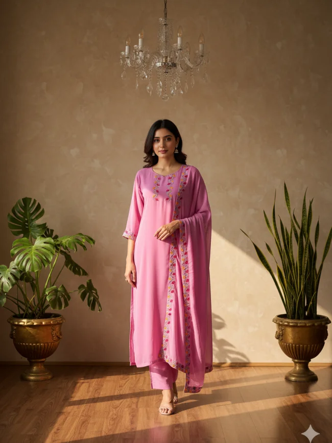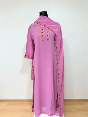 Ready to wear 2 Pcs Suit pink kurti is crafted from georgette fabric, known for its lightweight and flowy texture. It features delicate multi-colored floral embroidery along the neckline, sleeves, and dupatta border, adding a touch of elegance and charm.