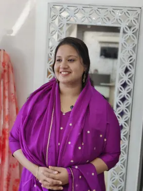 Graceful silky georgette 3-piece panel-cut A-line suit in a vibrant purple shade. Adorned with delicate golden polka embroidery and paired with a matching dupatta. Elegant, flowy, and available in this exclusive color