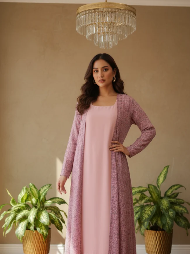 Elegant sleeveless slitted top with straight pants, paired with a long Ajrak-printed full-sleeve jacket.