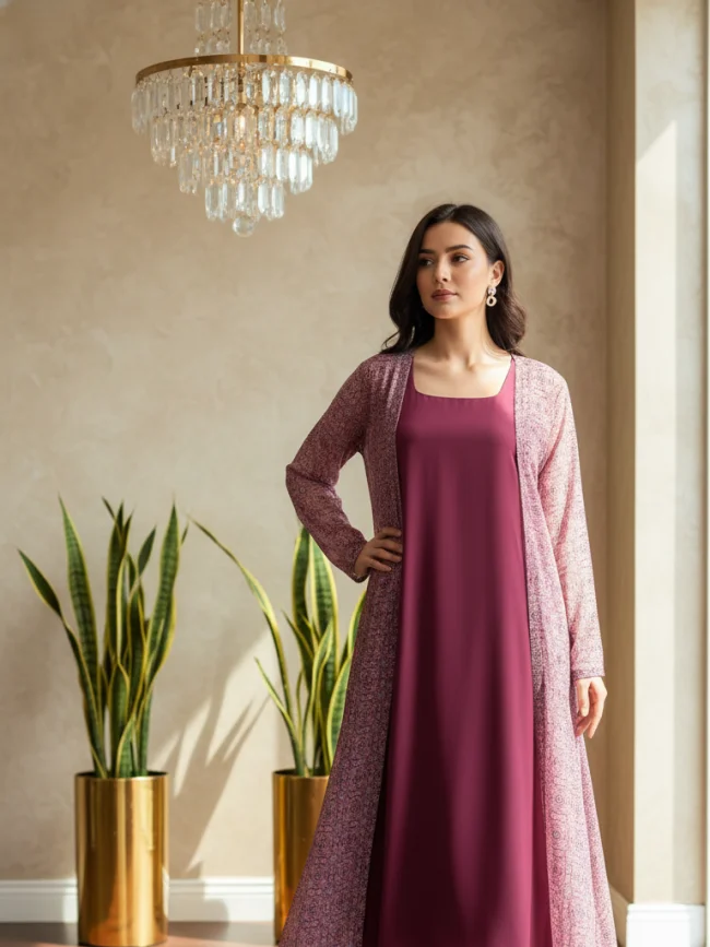 Elegant sleeveless slitted top with straight pants, paired with a long Ajrak-printed full-sleeve jacket.