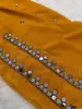 an unstitched dress material, likely for a suit or kurti and dupatta set, made of mustard yellow georgette fabric. It features intricate mirror work