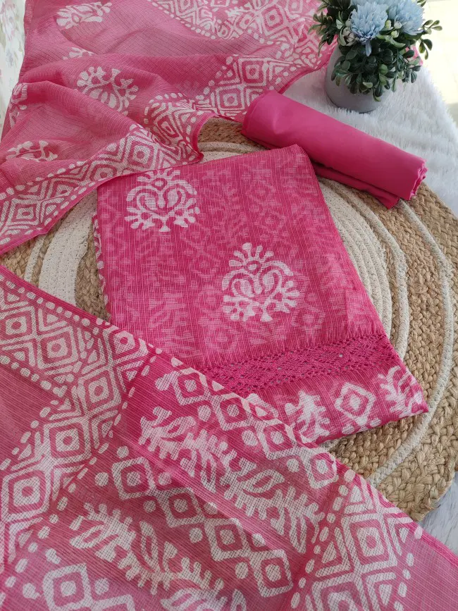 Grace your ethnic wardrobe with this elegant Net Kotta unstitched salwar set in a vibrant pink hue. Featuring delicate white woven motifs, a beautifully detailed dupatta, and a matching soft bottom fabric.