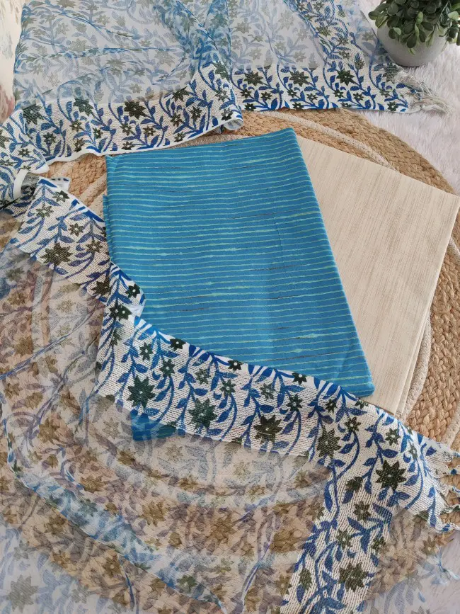 “Semi tussar top with subtle kantha lines paired with a soft digital-print organza shawl featuring beautifully textured jute borders — a classy and lightweight combo perfect for effortless elegance.”