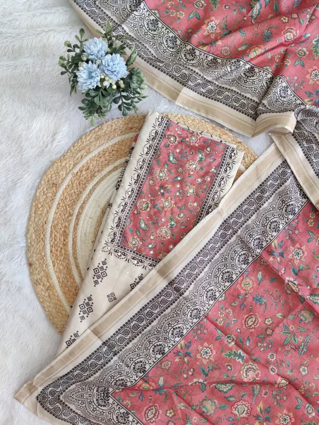“Elegant semi-tussar set featuring a digitally printed dupatta and a beautifully highlighted yoke with delicate hand embroidery — a perfect blend of tradition and timeless charm.”